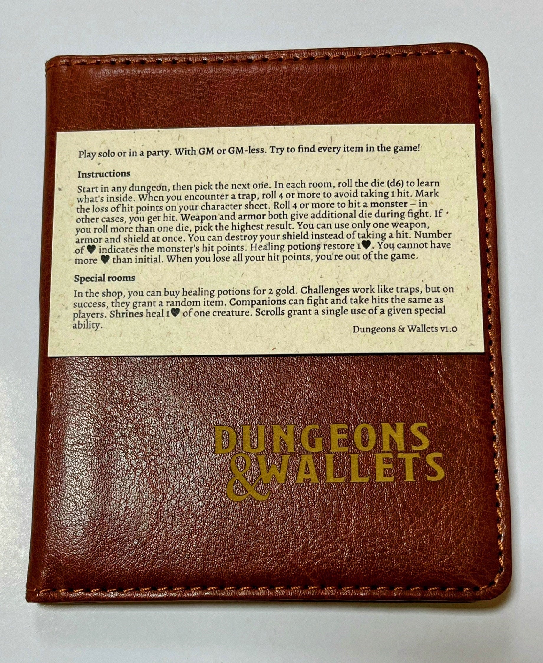 Dungeons & Wallets is a tiny, standalone tabletop role-playing game packed inside a custom-made wallet.