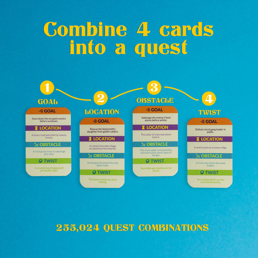 Combine any 4 cards for a unique quest: one Goal, one Location, one Obstacle, one Twist